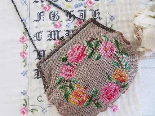 両面に薔薇のリースの可愛いプティポワン刺繍と