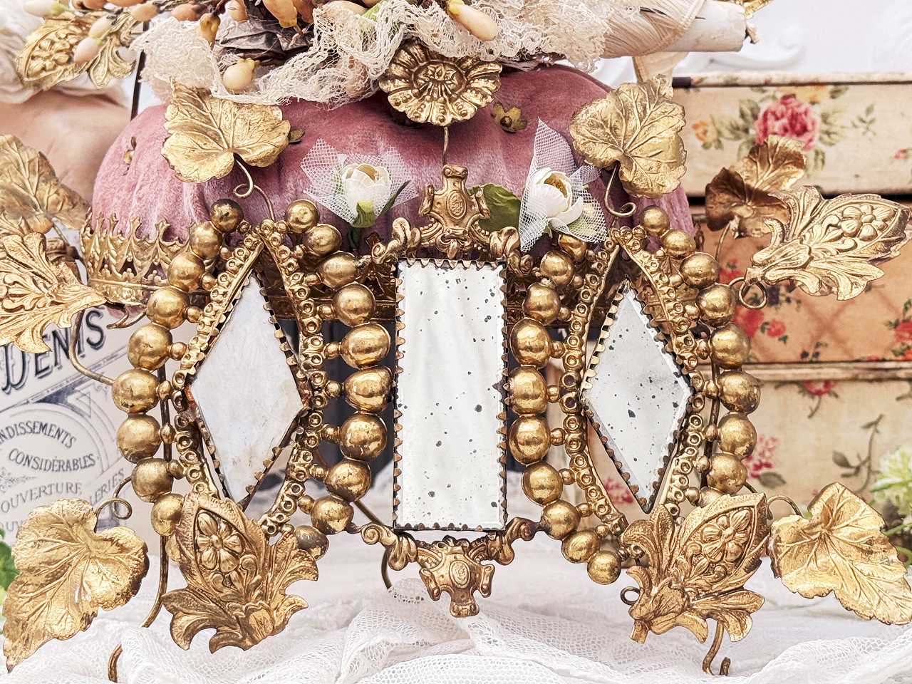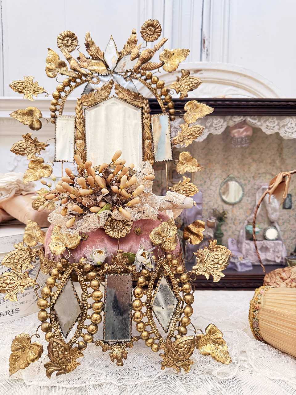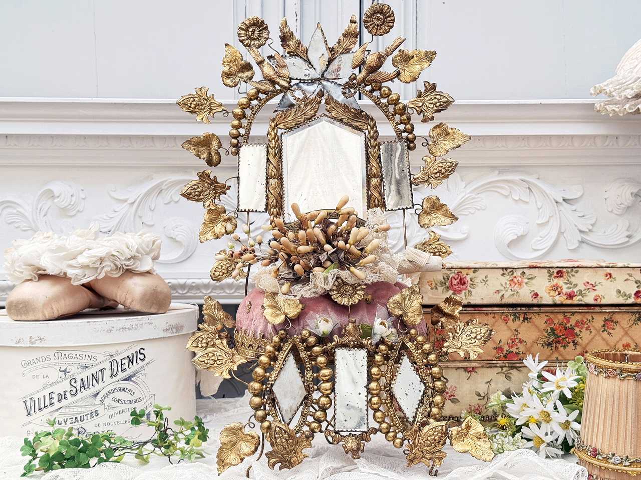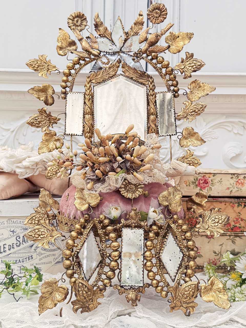真鍮の鳩やアカンサスの葉、ミラーの装飾にぐるりと囲まれ