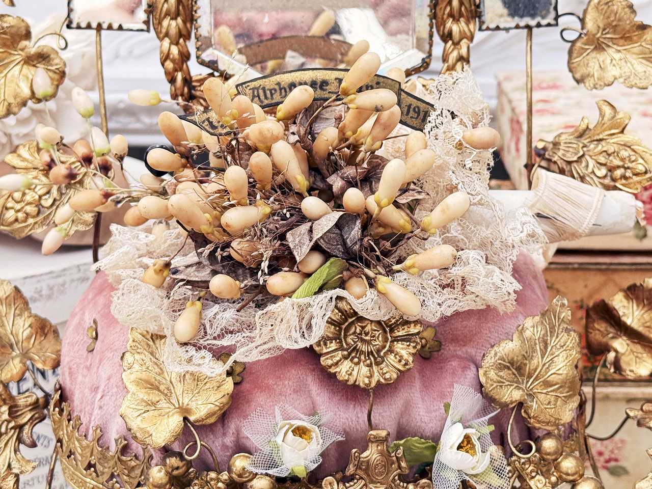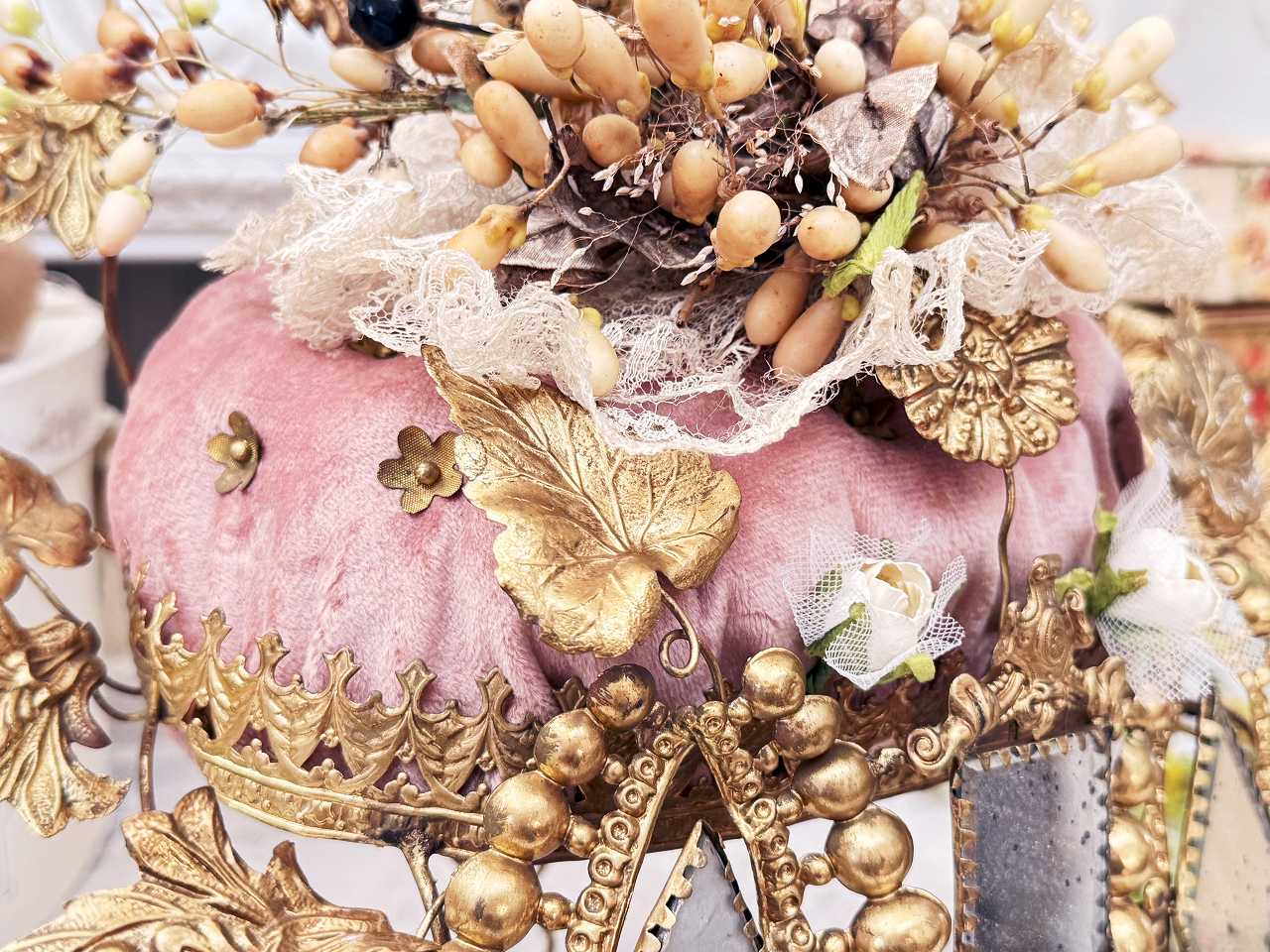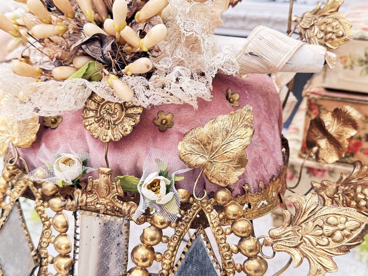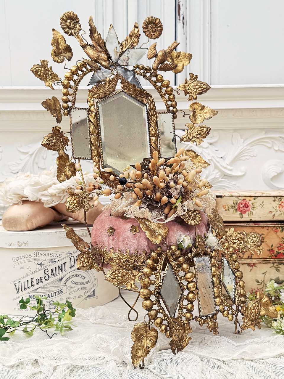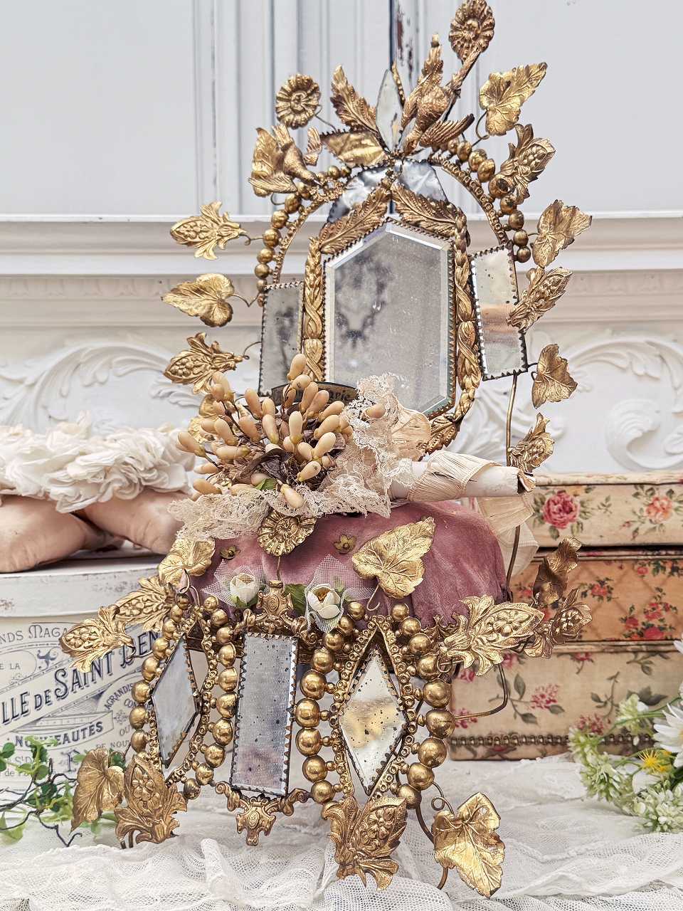 真鍮の鳩やアカンサスの葉、ミラーの装飾にぐるりと囲まれ