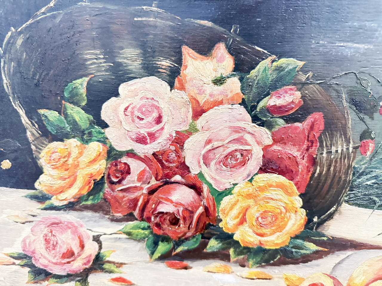 花かごからこぼれ落ちる薔薇と瑞々しい果実を描いた、穏やかな作品で