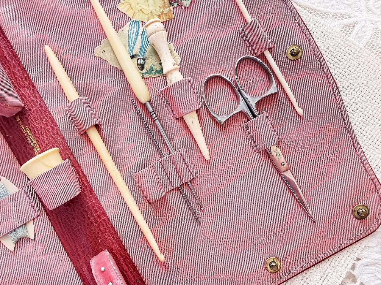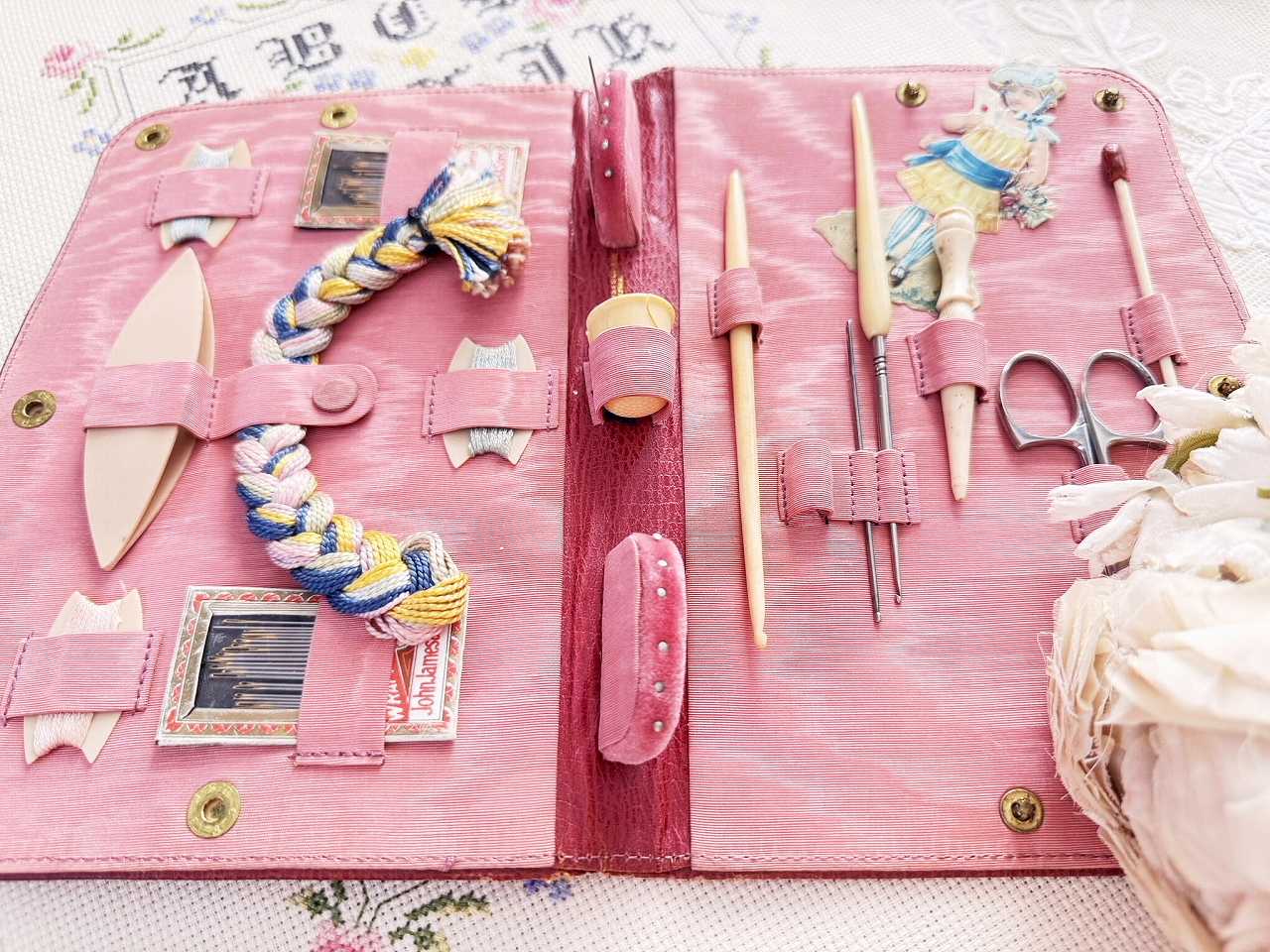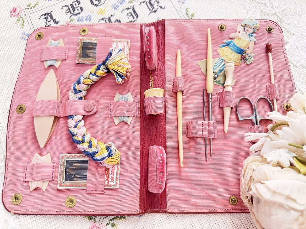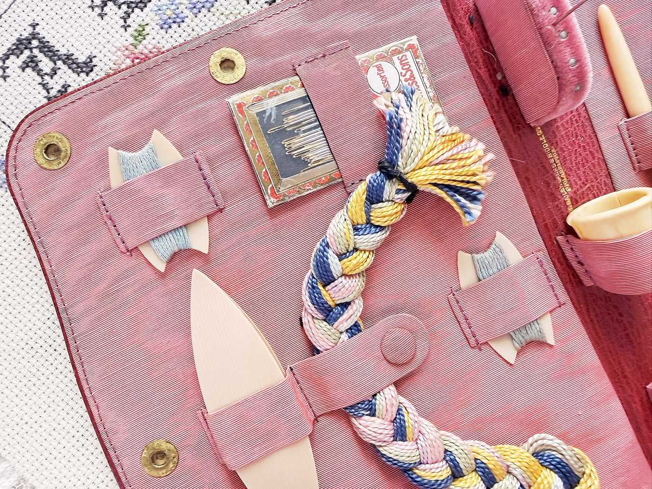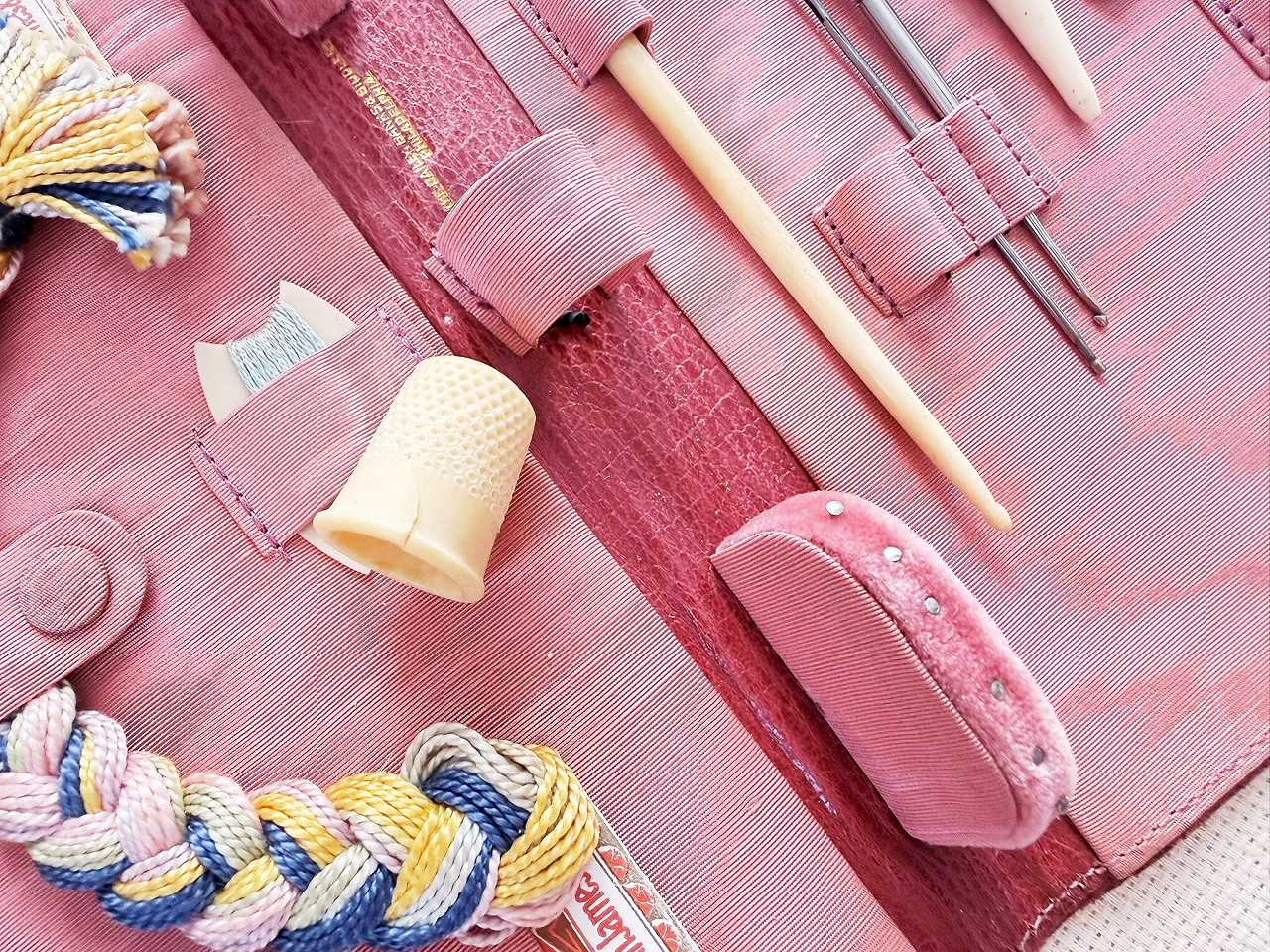 糸、糸巻き、針、指貫、編み棒、通し棒、ハサミ、ピンクッションと、