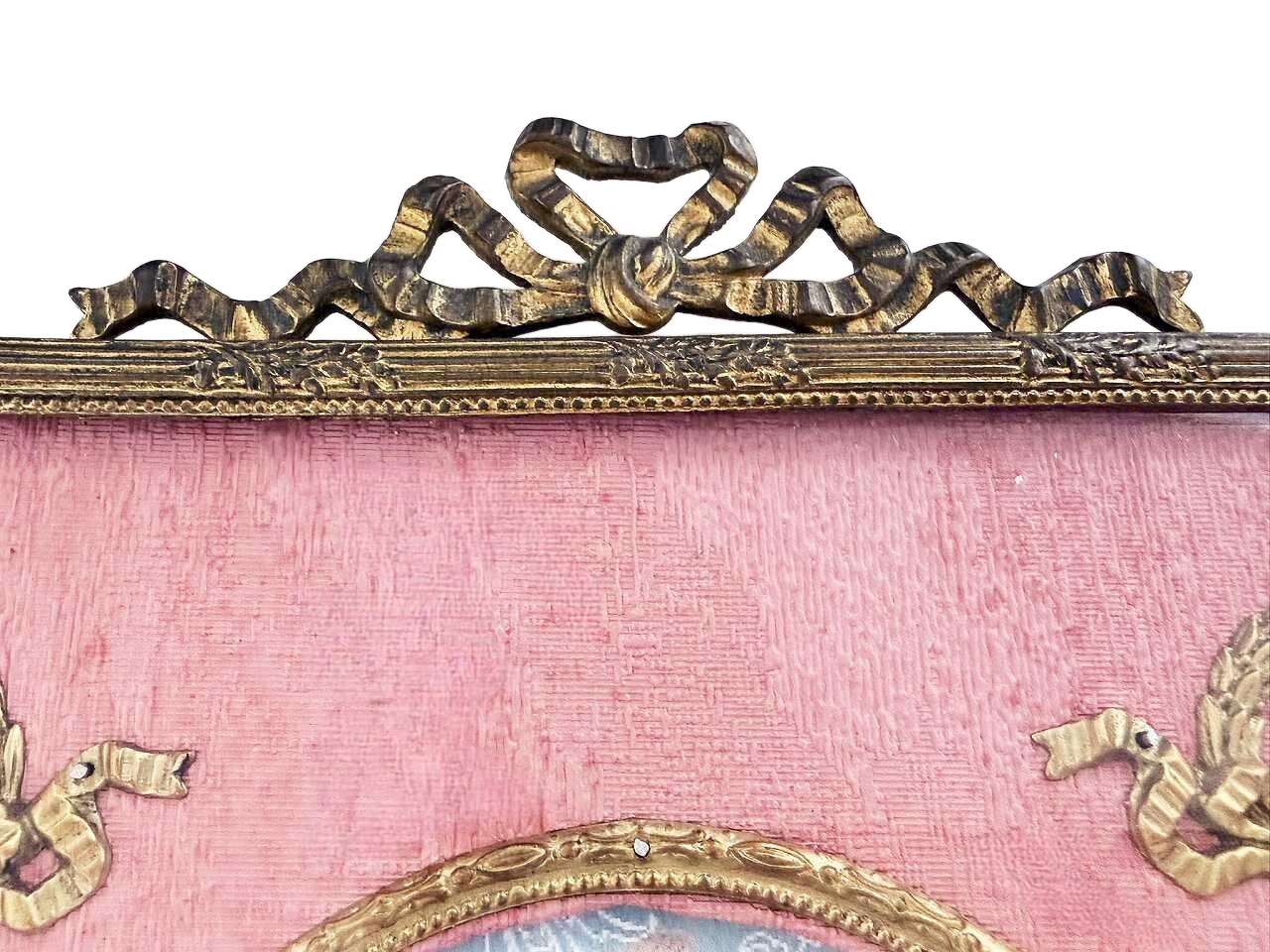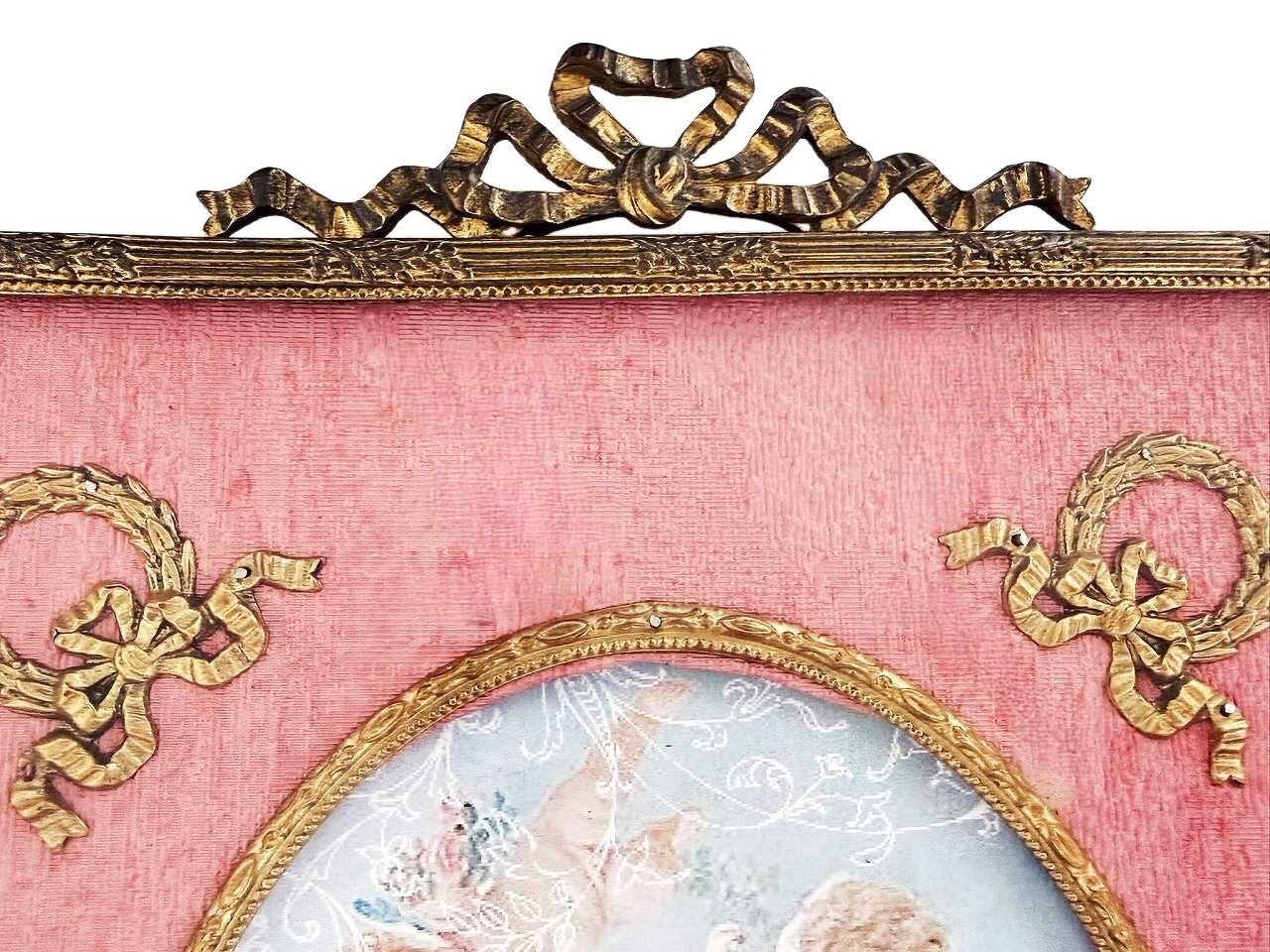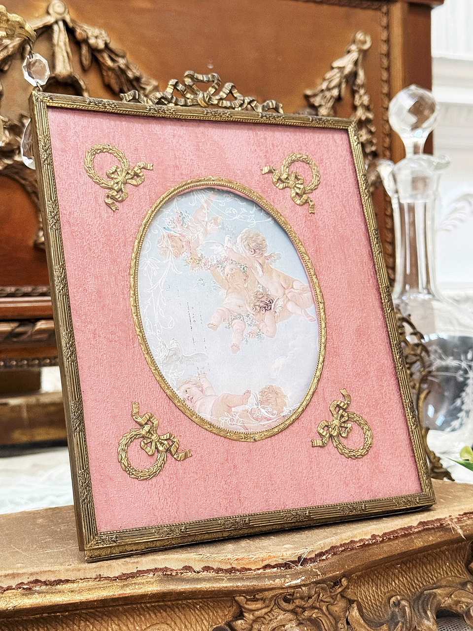 ローズピンクのモアレ地に月桂樹の貴族の紋章のオルモル装飾が