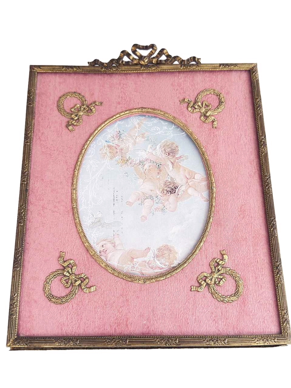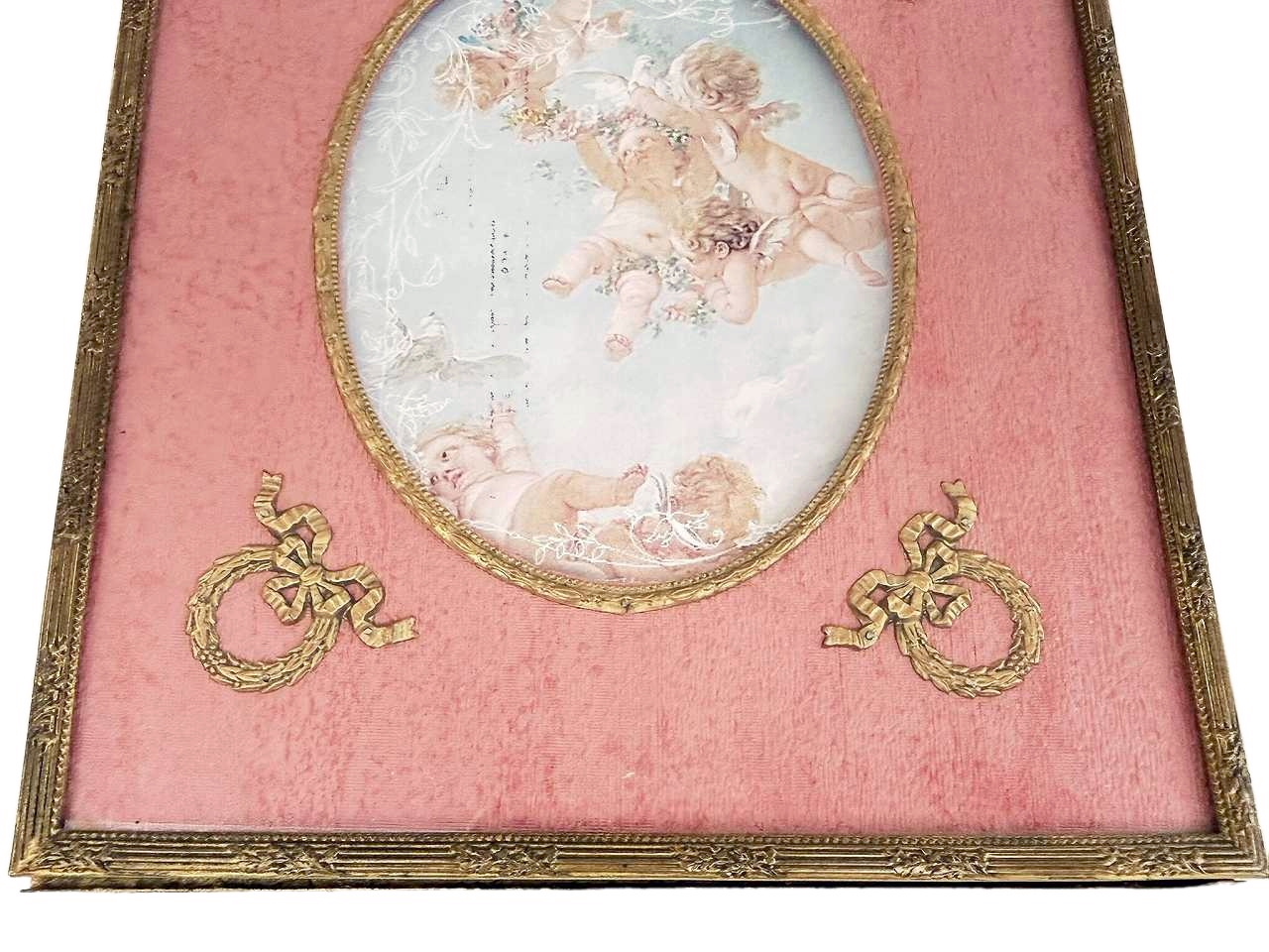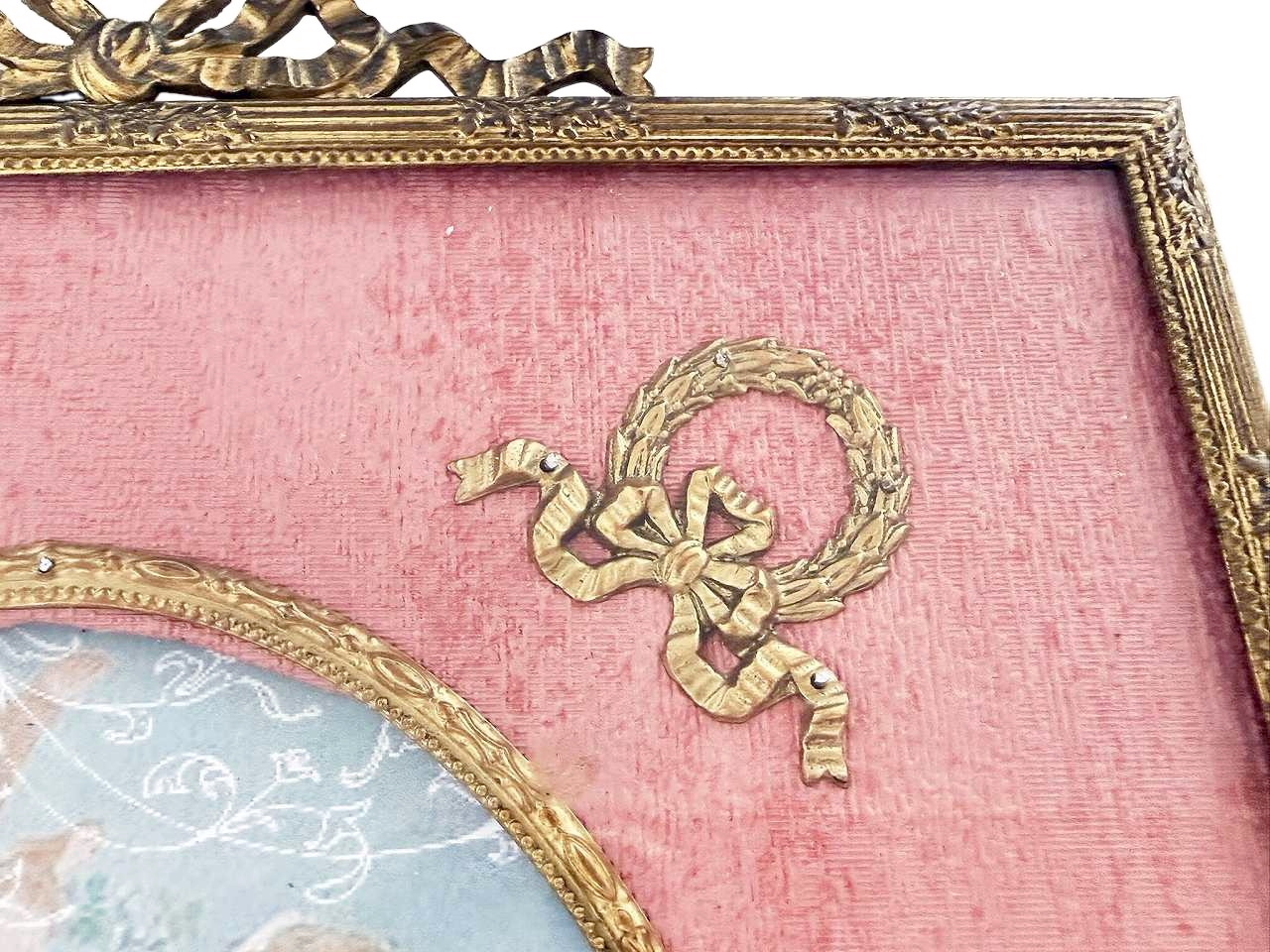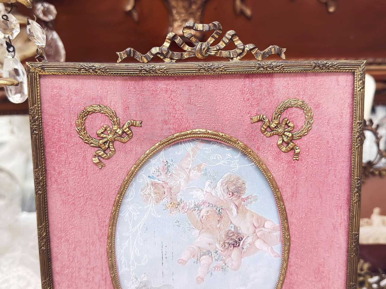 ローズピンクのモアレ地に月桂樹の貴族の紋章のオルモル装飾が